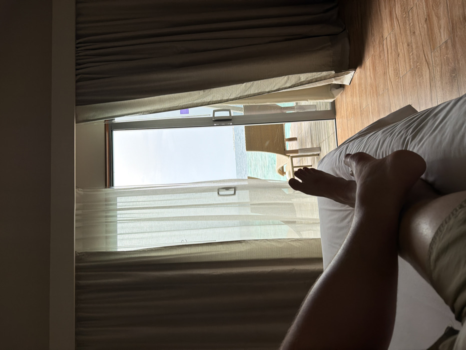The image depicts a first-person perspective from an interior room, likely an overwater bungalow in the city of Unknown, Maldives. In the foreground, a person's lower legs and bare feet are visible, resting crossed on a white bedsheet. The room features light brown opaque curtains, partially drawn to both sides, framing a glass sliding door with white handles. A sheer white curtain hangs behind the left opaque curtain. The interior floor is light brown wood or laminate. Through the open sliding door, an exterior wooden deck is visible, extending over clear turquoise ocean water. On the deck, a light-colored woven armchair and a small round table are present. The ocean stretches to a distant horizon under a bright, overcast sky.