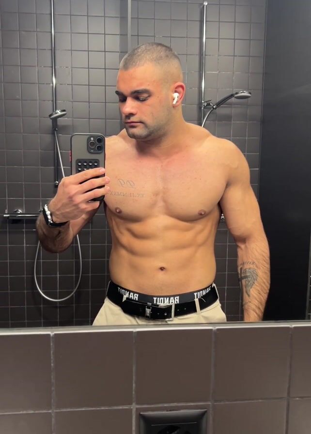 A shirtless man is taking a selfie in a bathroom mirror. He has a buzz cut, fair skin, and is wearing white wireless earbuds, a watch, and khaki pants with a black belt. He is holding a phone with multiple camera lenses. He has a tattoo on his left forearm and writing on his chest. The bathroom has dark grey tiled walls and a tiled mirror frame. Two shower heads are visible behind him. A ventilation outlet is visible below the mirror.