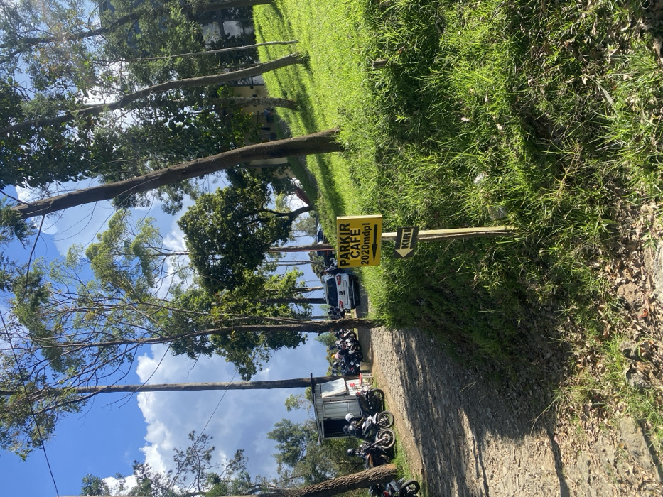 dirt road leading to a sign in front of a cafe parking lot in Kecamatan Tawangmangu, Indonesia, at coordinates -7.661 latitude, 111.185 longitude. The sign is yellow with black letters and reads "PARKIR CAFE 2020mdpl" in Indonesian. The sign is mounted to a wooden post and is pointing left, with a second sign below it that reads "KIRI" in Indonesian, also pointing left. There are motorcycles parked on the left side of the road, while trees and foliage fill the background. The scene is surrounded by lush green grass and is a bright, sunny day.