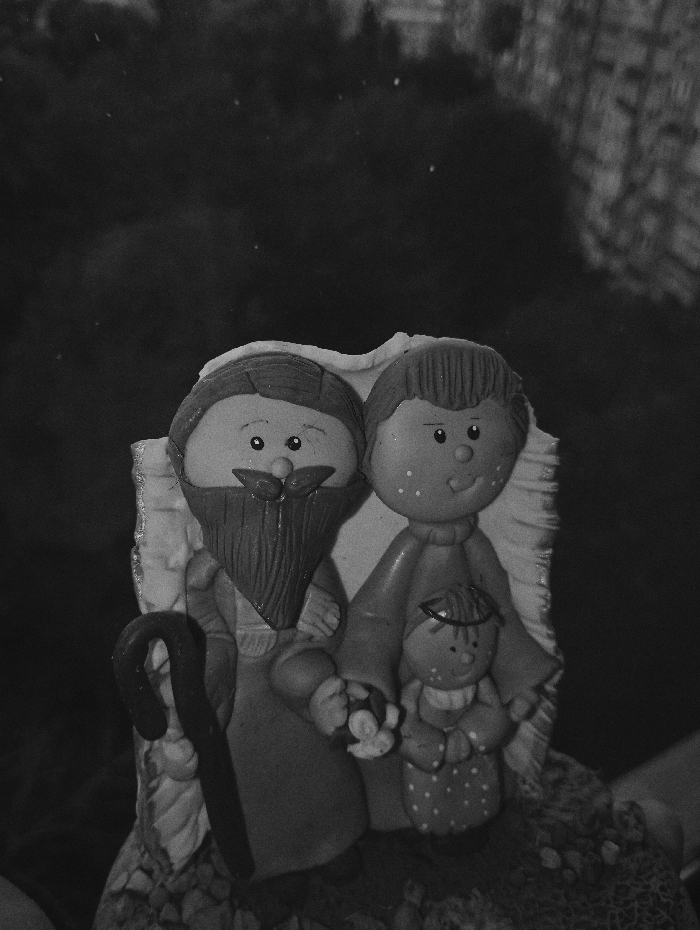 A monochrome, low-light photograph captures a three-figure craft figurine. The central subject consists of three stylized, possibly clay or ceramic, figures arranged on a decorative, textured base. On the left, a male adult figure with a prominent beard and a dark robe holds a curved staff. To his right, an adult female figure in a robe cradles a smaller baby figure, which is depicted in a patterned garment. All figures feature simplified, round faces with small dot eyes and faint, smiling expressions. The background is dark, indistinct, and heavily out of focus, showing only minor light specks or particulate matter. No discernible environmental or architectural features are present to identify a specific location within Buenos Aires, Argentina.