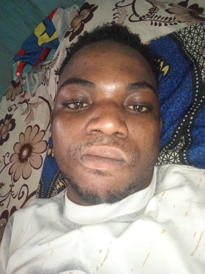 Unknown location in the city of Unknown, Unknown. An indoor close-up portrait depicts an adult male of African descent, positioned in a supine or semi-supine orientation. The subject has short, dark, curly hair and dark stubble on his chin and upper lip. His brown eyes are open and directed towards the camera; the periorbital area appears mildly puffy. His mouth is closed, exhibiting a slight asymmetry of the lips. He is wearing a white long-sleeved crew-neck shirt with faded grey detailing near the collar and scattered light brown splatter-like marks across the front. The immediate background consists of two distinct bedding patterns: a cream-colored fabric with light brown floral motifs on the viewer's left, and a dark blue fabric with white geometric and dot patterns on the viewer's right. A crumpled multicolored fabric, displaying segments of blue, yellow, and red, is partially visible in the upper left corner. The individual is looking directly at the camera.