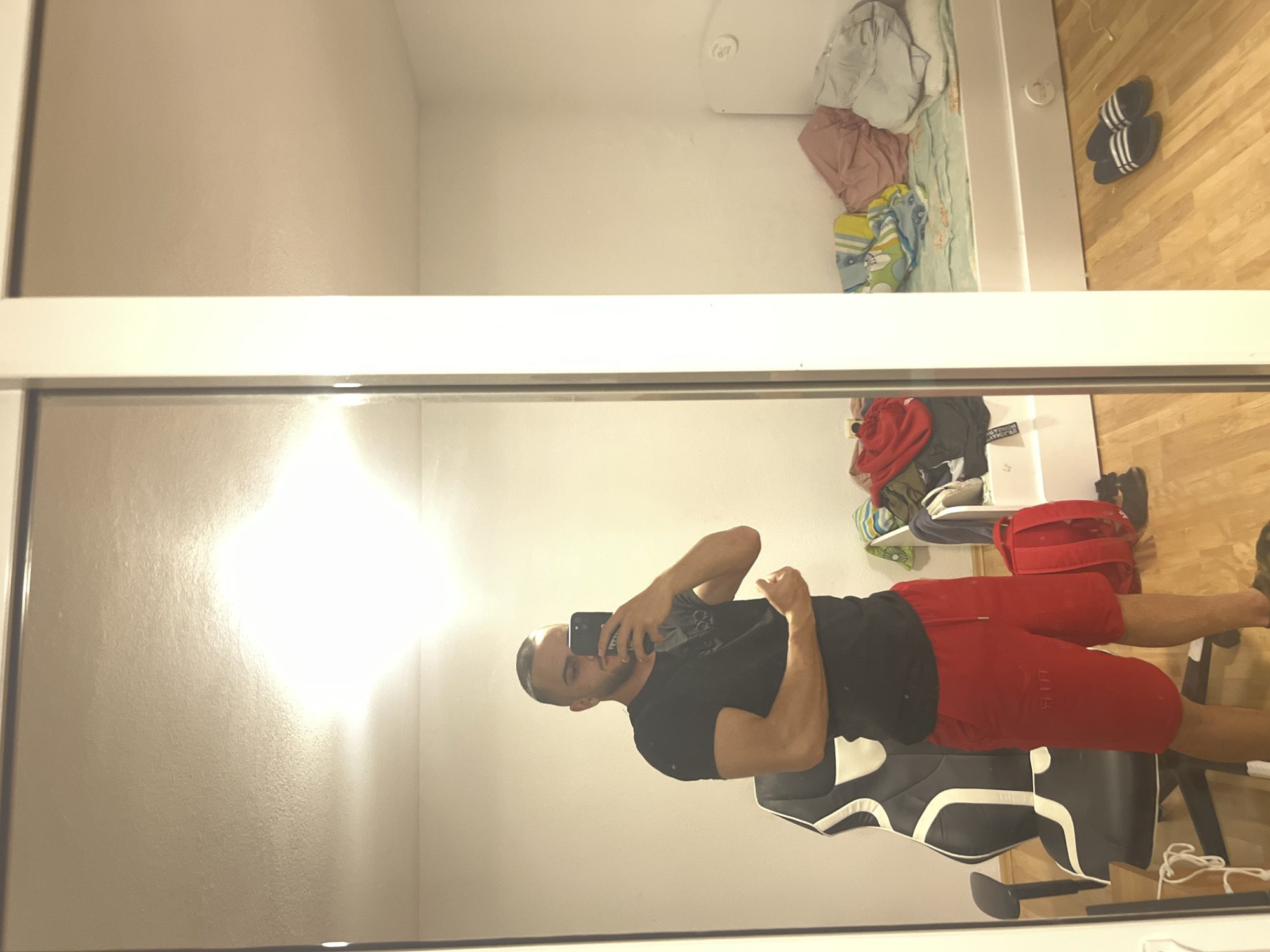 man taking a selfie in a mirror. The man is wearing a black t-shirt and red shorts. He is standing in front of a gaming chair. In the background, there is a pile of clothes on a shelf and a pair of Adidas sandals on the floor. The location is a room, with an indeterminate city location.