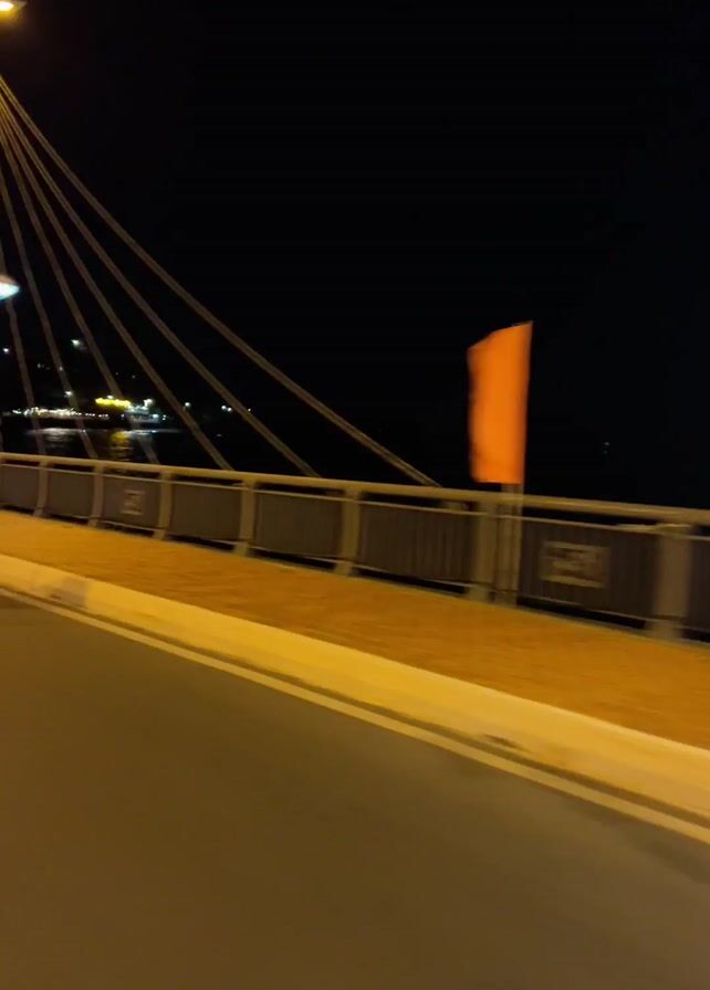 A video depicts a motorcycle driving across a bridge at night