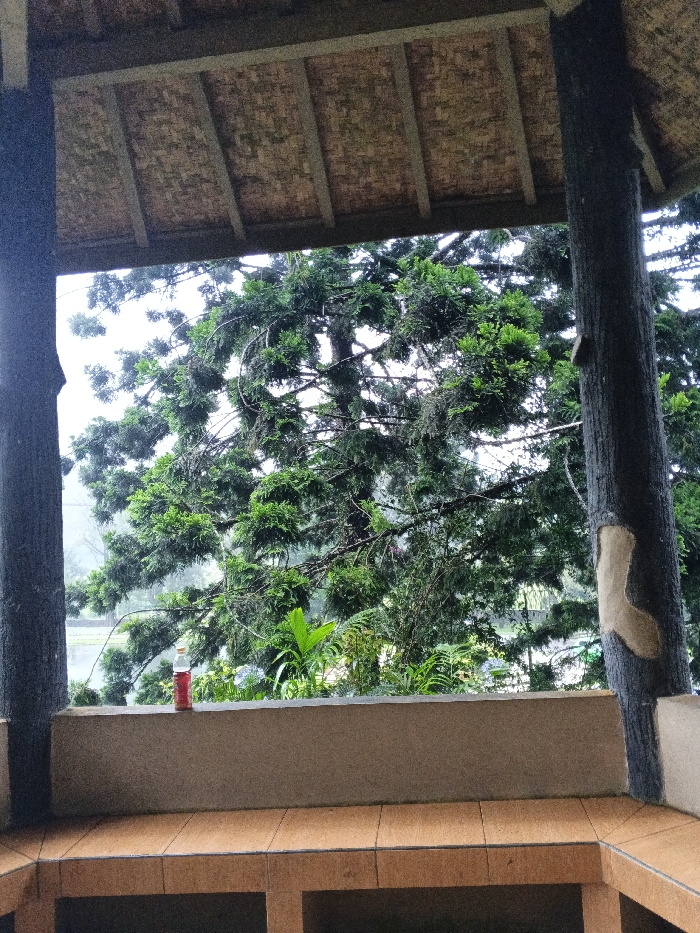 An outdoor shelter provides a view of dense green trees and foliage. The shelter has dark-stained wooden pillars supporting a textured roof. A low wall borders the open side, where a bottle sits on the wall, interrupting the view of the landscape. The shelter's base is tiled. The overall scene conveys a sense of tranquility and connection with nature.