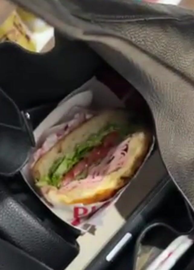 person holding a black purse with a sandwich inside. The sandwich appears to have ham, lettuce, and tomato on it. The person is standing near a shelf with various drinks. The camera zooms into the sandwich and then pans back out.