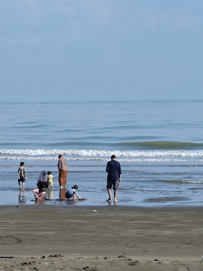 This image displays a beach scene in Reudeuep, Indonesia, under a light blue sky with minimal, scattered clouds. The ocean extends across the midground, featuring light blue water with visible lines of breaking waves generating white foam. The foreground consists of a dark, wet sand flat where the water meets the shore, transitioning to lighter, drier sand towards the bottom. Seven individuals are present on the beach, interacting with the sand and shallow water. From left to right: 1. A child wearing a dark, patterned t-shirt and dark shorts stands in the shallow water, facing right. 2. A woman wearing a light-colored head covering and attire stands in shallow water, slightly hunched, near a smaller child. 3. A very young child, wearing a yellow top, stands in shallow water next to the first woman. 4. A second woman, wearing a light brown head covering and a long, light brown skirt or sarong, stands with her back to the viewer in the shallow water. 5. A child wearing a pink top and dark pants, with a visible light-colored face mask, is crouched on the wet sand, actively digging with their hands. 6. A second child, wearing a blue t-shirt and dark pants, is also crouched on the wet sand to the right of the first child, engaged in digging with their hands. 7. A man wearing a dark blue t-shirt and dark shorts stands with his back to the viewer in the shallow water on the right side of the group. Faint linear marks are visible in the sand in the immediate foreground. A small, light-colored object rests on the wet sand to the right of the central grouping.