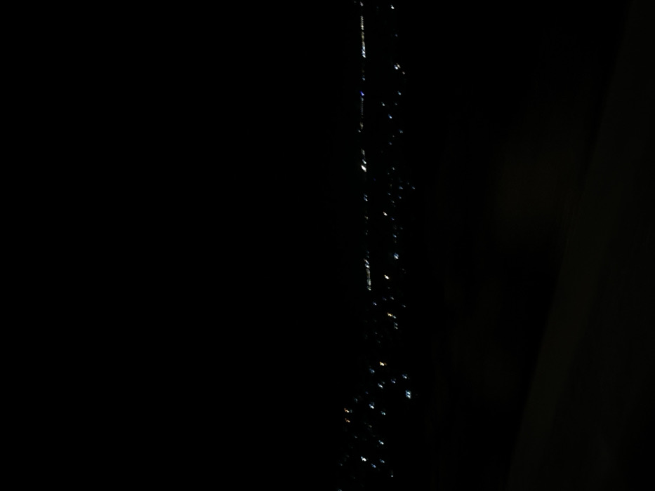 The image displays a distant, night-time view of the city of Al-Hama, Syria. The upper approximately 60-70% of the frame consists of solid black, representing the night sky. Across the lower-middle section, a horizontal band of numerous small, blurry, and out-of-focus light sources is visible. These lights are predominantly white and yellow, with occasional faint blue or green hues, characteristic of urban illumination viewed from a distance. The bottom 10-20% of the frame is a dark, indistinct area, suggesting a foreground landmass or elevated terrain. No discernible individuals, specific structures, or objects are visible. No actions or interactions are depicted. The environment is characterized by extensive darkness punctuated by scattered artificial city lights.