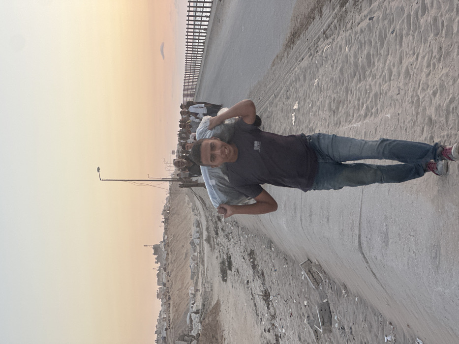 The image depicts an outdoor scene in the city of Nuseirat, Palestinian Territory, during what appears to be either dusk or dawn, characterized by a sky transitioning from orange to light blue. In the foreground, a young male, wearing a dark t-shirt, blue jeans, and light-colored shoes, walks towards the camera on a sandy embankment. He carries a large, light-colored bundle, consistent with a mattress or bedding, over his right shoulder and upper back, and displays a slight smile. To his right, a paved road runs parallel to the sandy path, extending into the background. Along this road, a line of multiple individuals, primarily men, walk away from the camera. Some individuals in this procession are also carrying bundles or bags. A street light pole stands prominently on the paved road, with associated wiring. Further along the road, a dark-colored barrier or railing separates the road from a body of water, likely the Mediterranean Sea. On the left side of the image, beyond the sandy foreground, a populated settlement or camp is visible on elevated, sandy terrain. This settlement features numerous structures, some appearing temporary or damaged, and includes a more prominent, taller building in the distant background. The overall environment is dusty and sandy.