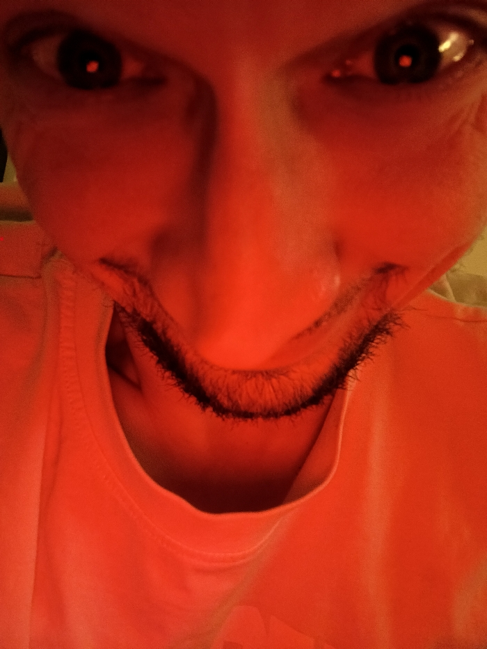 A close-up, downward-angled selfie captures a person's face illuminated by intense red light