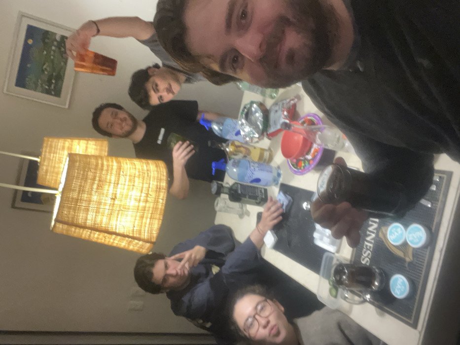 Five individuals are depicted in an indoor setting, identified as Mexico City, Mexico, gathered around a rectangular table. The image is captured from a close perspective, likely a selfie. In the immediate foreground, a male with dark hair and a full beard, wearing a dark long-sleeved shirt, holds a dark-colored glass in his right hand, looking directly at the camera. To his left, a female with glasses and dark curly hair, wearing a light grey top, leans forward with pouted lips. Behind the foreground individuals, three other males are visible. From left to right: a male with dark hair, wearing a dark long-sleeved garment, extends his right hand with a two-finger V-sign gesture. His left hand, holding a small white cloth or napkin, is on the table, appearing to wipe the surface. Next to him, a male with dark hair and a beard, wearing a black t-shirt, holds a green cup. Further right, a male with a mullet-style haircut and a mustache, wearing a grey t-shirt, holds an orange translucent cup aloft. The table surface is light-colored and cluttered with various items. These include a black bar mat with "GUINNESS" branding and three light blue coaster-like objects, a glass mug containing a dark liquid, a clear container with green slices, two dark liquor bottles, two light blue water bottles with white pump tops, a clear bottle with yellow liquid, a crumpled foil object, a colorful patterned plate containing a red bowl and an empty clear bottle (possibly hot sauce), and another clear bottle. The background consists of off-white walls. Two pendant lights with woven, light-colored shades hang above the table, emitting warm light. Two framed artworks are visible on the wall: an abstract piece on the left and a landscape painting on the right.