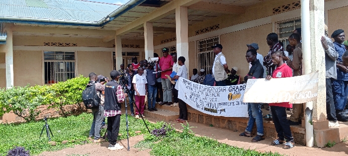The image captures an outdoor gathering in Kundu 1, Democratic Republic of the Congo, in front of a single-story building with light-colored walls, a blue corrugated metal roof, and a covered porch supported by white pillars