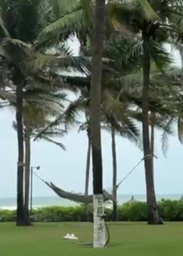 The video presents a stationary shot of a tropical landscape, featuring several tall palm trees swaying gently in the wind against a cloudy, overcast sky. In the foreground, there's a well-maintained lawn, and in the background, the ocean can be seen, appearing calm. A hammock is strung between a few of the palm trees, creating a relaxing scene. A pair of white shoes sits on the lawn near the base of one of the trees. The overall mood is serene despite the potentially windy conditions indicated by the swaying palms.