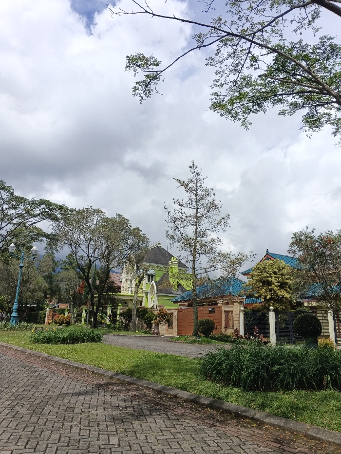 A scenic shot reveals a paved walkway alongside a grassy area. Whimsical houses with bright green facades and vibrant blue tiled roofs are nestled among trees. The sky overhead is overcast, covered with grey and white clouds. A tall, leafless tree stands prominently in front of the colorful houses. A traditional street lamp provides additional light to the area.