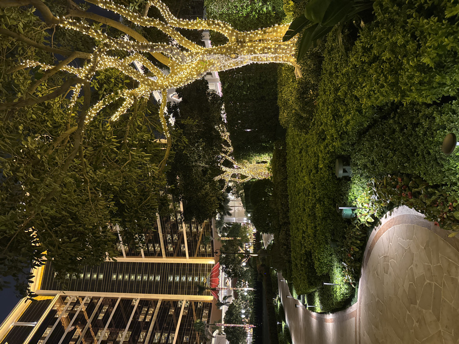 The image displays an illuminated outdoor garden scene at night in Unknown, Macao. A tall, multi-story building with a reflective, gold-tinted glass facade and vertical amber strip lighting occupies the left background. A winding, irregularly-shaped flagstone pathway with a reddish-brown border extends from the lower left towards the center, bordered by numerous small, ground-level lights. The foreground and mid-ground are densely populated with manicured green hedges and bushes. Several trees are prominently featured, with their trunks and branches extensively wrapped in warm white string lights, providing significant illumination. Other trees with natural green foliage are also present. In the mid-ground, adjacent to the main building, a red, scallop-edged canopy structure is visible amidst palm trees and additional illuminated plantings. A section of a white building with ornate architecture is dimly discernible in the right background. No individuals are present.