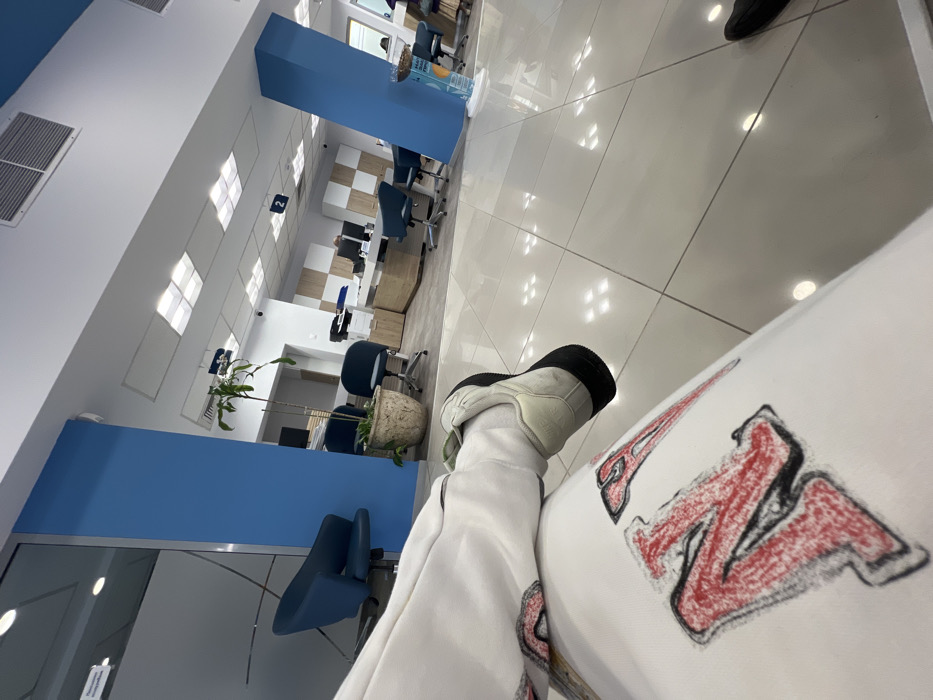The image depicts the interior of a modern public-facing office, likely a bank or administrative building, located in Unknown, Unknown. The perspective is from a seated individual, with their legs and feet occupying the immediate foreground. The person wears white sweatpants featuring a large, stylized red and black "N" graphic on the thigh, and light-colored athletic shoes with a thick black sole. The environment features a highly reflective, light grey tiled floor. The walls are predominantly white, accented by prominent bright blue pillars and wall sections. The ceiling is white with multiple square recessed lighting fixtures providing ample illumination, along with air conditioning vents. In the mid-ground, a waiting area includes several blue-grey swiveling office chairs with wheels. A potted plant in a textured ceramic pot is situated near a blue chair. Further into the background, an open-plan office layout is visible with multiple service desks constructed from light-toned wood with white countertops. Desktop computers with monitors are present on these desks. A white sign displaying the numeral "2" hangs from the ceiling over one section. A person is partially visible seated behind one of the service desks. Another person's dark shoe is visible on the far right edge of the floor, indicating their proximity. The overall scene suggests a clean, well-maintained, and professionally organized space.