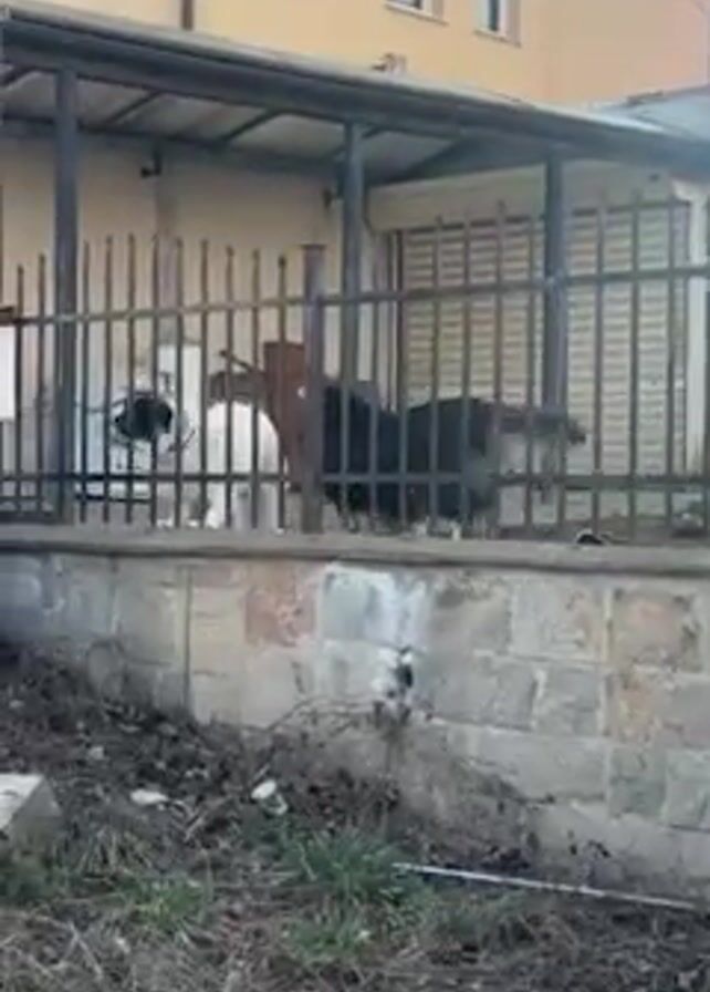 two dogs behind a black metal fence. The fence surrounds a concrete base with a covered porch-like structure behind it. One dog is white, and the other is black and grey. Both dogs are barking. To the left of the fence, there is a blue trash can with the number 14 written in green on the side. Behind the fence, there are various objects, including what appears to be an old oven. The environment appears to be residential, with a two-story tan building in the background. A white car is partially visible on the right side of the frame. The ground in front of the fence is covered with dry vegetation and some litter.