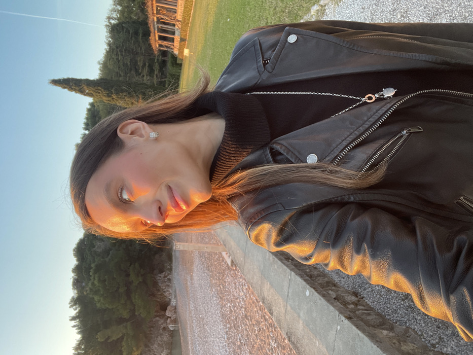 A single female individual is depicted outdoors in Sveti Stefan, Montenegro, during golden hour lighting. She is positioned slightly off-center to the right, looking upwards and to her left with a subtle smile. Her long, dark brown hair is parted centrally and falls over her shoulders. She wears a black turtleneck sweater, a black leather motorcycle-style jacket with zippered elements and silver snaps, and small, square-shaped faceted earrings. A long silver chain necklace with a multi-component pendant featuring a copper-colored ring and an irregular light-colored stone is visible around her neck. Warm, golden light illuminates her right cheek, neck, and the left side of her jacket. The immediate foreground features a concrete edge or barrier on the left, separating the paved surface where the subject stands from a narrow, light-colored pebble beach. Beyond the beach, a dense hillside covered with dark green coniferous trees is visible. To the right of the subject is a manicured green lawn. In the mid-ground right, a tall, slender dark green cypress tree stands. Further in the background, a stone or concrete pergola-like structure with a reddish-brown tiled roof is partially visible. The sky is clear and light blue, transitioning to a warmer hue near the horizon, indicative of late afternoon or early morning.
