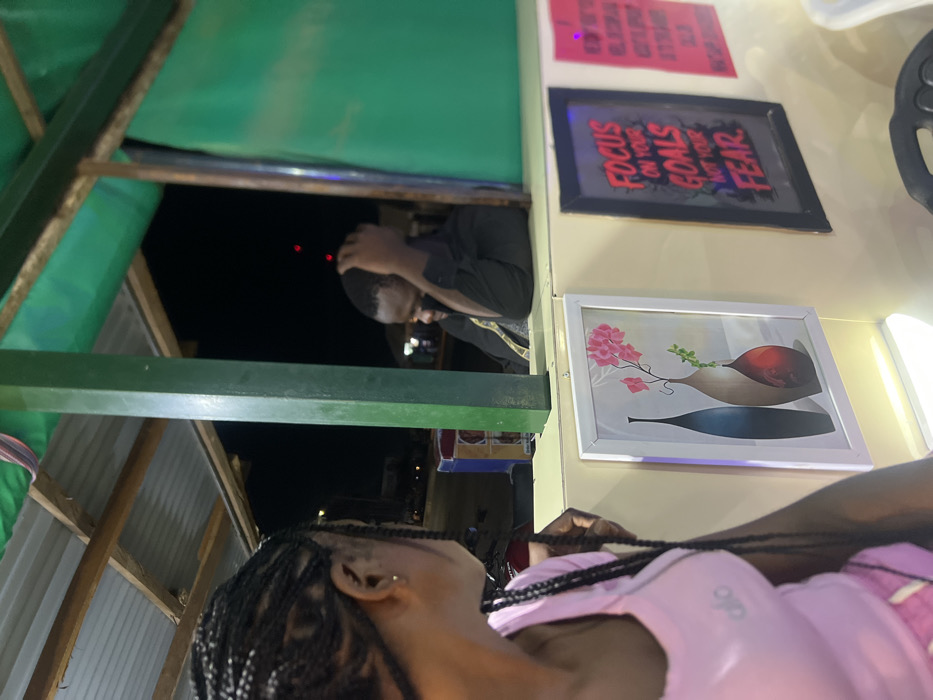 A woman with braided hair, wearing a pink shirt, faces the camera. A man with short hair and a dark shirt is seen through a window, appearing to be inside a building. Behind the window, it is dark, suggesting nighttime. On the interior wall near the window, there are two framed pictures: one with flowers and vases and another with motivational text. There's also a red sign above the frame. The image appears to have been taken from a tilted angle, and there are green structures in the foreground.