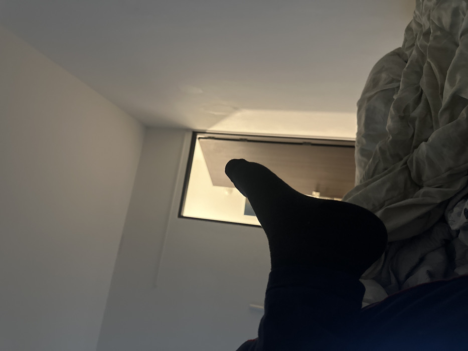 A low-angle perspective features a foot clad in a black sock pointing towards an open window