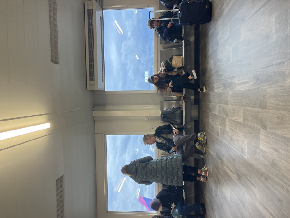 waiting area in a ferry terminal. There are five people waiting, four of them sitting on grey benches facing the window. The person on the left is wearing a black jacket and is sitting with their legs crossed. The person next to them is wearing a grey jacket and their legs are stretched out. The person sitting on the right is wearing a brown jacket and is holding a cup in their hand. There is a man sitting between the two women, wearing a dark grey jacket and dark pants. The fifth person is standing in front of the window. They are wearing a grey jacket and have their back turned towards the camera. There is a large window behind them, with a blue sky with clouds in the background. The floor is wood-laminate. The room is lit by fluorescent lights. This image depicts the waiting area of a ferry terminal in Tillé, France.