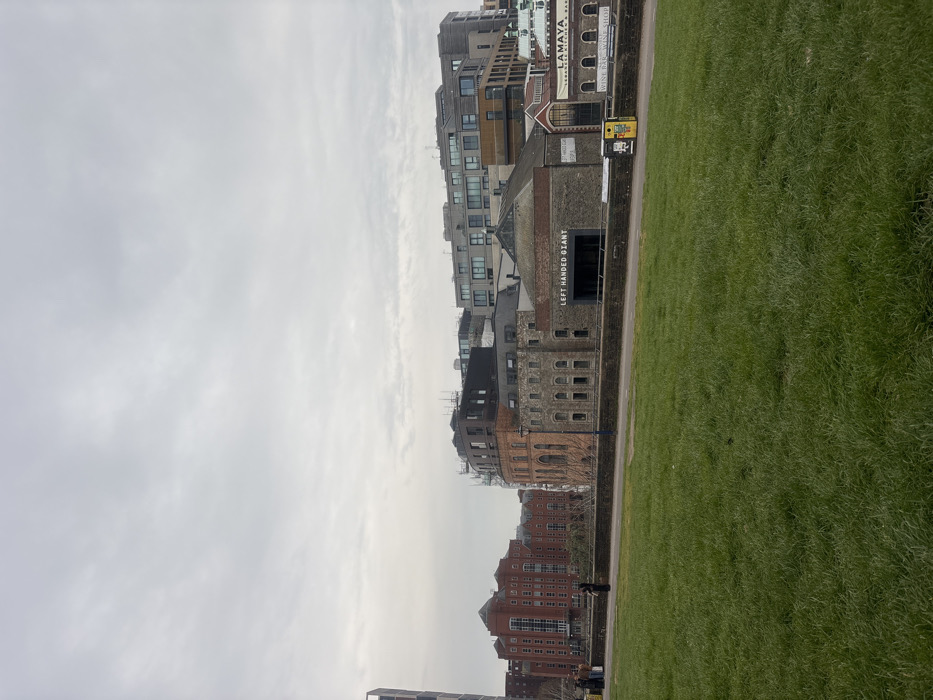 The image depicts an urban scene in Finzels Reach, Bristol, United Kingdom, under an overcast sky. The foreground is dominated by a green grass lawn. A paved pathway traverses the midground, bordered by a low, dark stone wall. A dark blue lamppost stands on the pathway to the left. To the right, two waste bins, one dark and one yellow with a recycling symbol, are positioned next to the wall. Behind the pathway, a series of buildings of varying architectural styles are visible. From left to right: a portion of a modern dark building; a large, multi-story reddish-brown brick structure with numerous windows; a round, reddish-brown building with arched windows, partially obscured by scaffolding; a grey stone building with multiple small windows; a prominent grey industrial-style building bearing the white text "LEFT HANDED GIANT" above a dark entrance; and a lighter-colored building displaying signage for "LAMAYA LEBANESE KITCHEN & BAR" and "WINE BAR - WINE SHOP." In the background, several modern multi-story buildings with flat roofs and glass facades are visible, some exhibiting scaffolding. Approximately four individuals are present on the paved pathway in the left-midground, near the reddish-brown brick building. One figure appears dressed in a long, dark garment; specific actions and interactions are not discernible due to distance.