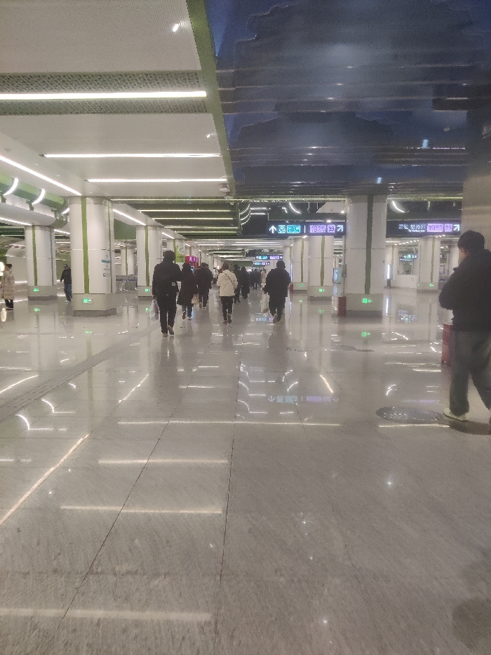 The image depicts a well-lit, spacious indoor transit area, specifically a subway station concourse or connecting passage, in Unknown, Unknown. Approximately fifteen to twenty individuals are visible, mostly in the mid-ground, walking away from the camera in a general forward direction. Most pedestrians wear dark winter outerwear, though one person on the far left wears a light-colored coat. The floor is composed of polished light grey or white tiles, exhibiting significant reflections of overhead lights and signage. Numerous white support columns, each featuring vertical green stripes or panels, line the passage. Several columns display small, green illuminated "EXIT" signs with non-Latin script. The ceiling incorporates long, horizontal fluorescent light strips. A section of the ceiling on the right side features a dark, reflective blue surface with irregular, cloud-like patterns, while the left ceiling section displays a white, perforated design. Overhead digital or illuminated signs with arrows and numbers (e.g., "19," "13," "192") in a non-Latin script (likely Chinese) and some English text are visible, providing directional information. A red fire extinguisher is positioned near a column on the right side of the mid-ground. A circular metal grate is present on the floor in the lower right foreground. The overall scene suggests a modern, active public transportation environment.