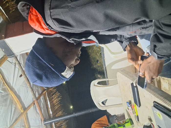 A person in a dark jacket and blue beanie appears to be charging a smartphone using a power bank. The device is resting on a table surface with a bottle, writing implements, and a laptop nearby. The setting appears to be dimly lit, possibly outdoors at night, with a structure of wooden beams and white fabric visible in the background. A white plastic chair is also in the scene.