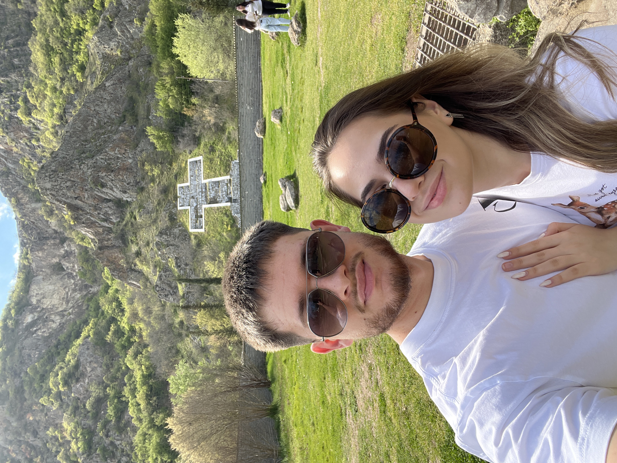 A selfie captures a man and a woman outdoors. The woman, with long brown hair, wears round sunglasses and a white t-shirt with a deer graphic. Her hand rests on the man's white t-shirt. The man, also in sunglasses, has short hair and a beard. The background features a grass-covered area leading to a large stone cross, stairs, and other individuals further away. A rocky cliff covered in trees is visible in the upper left. The location is assumed to be in the vicinity of General Todorov, Bulgaria.