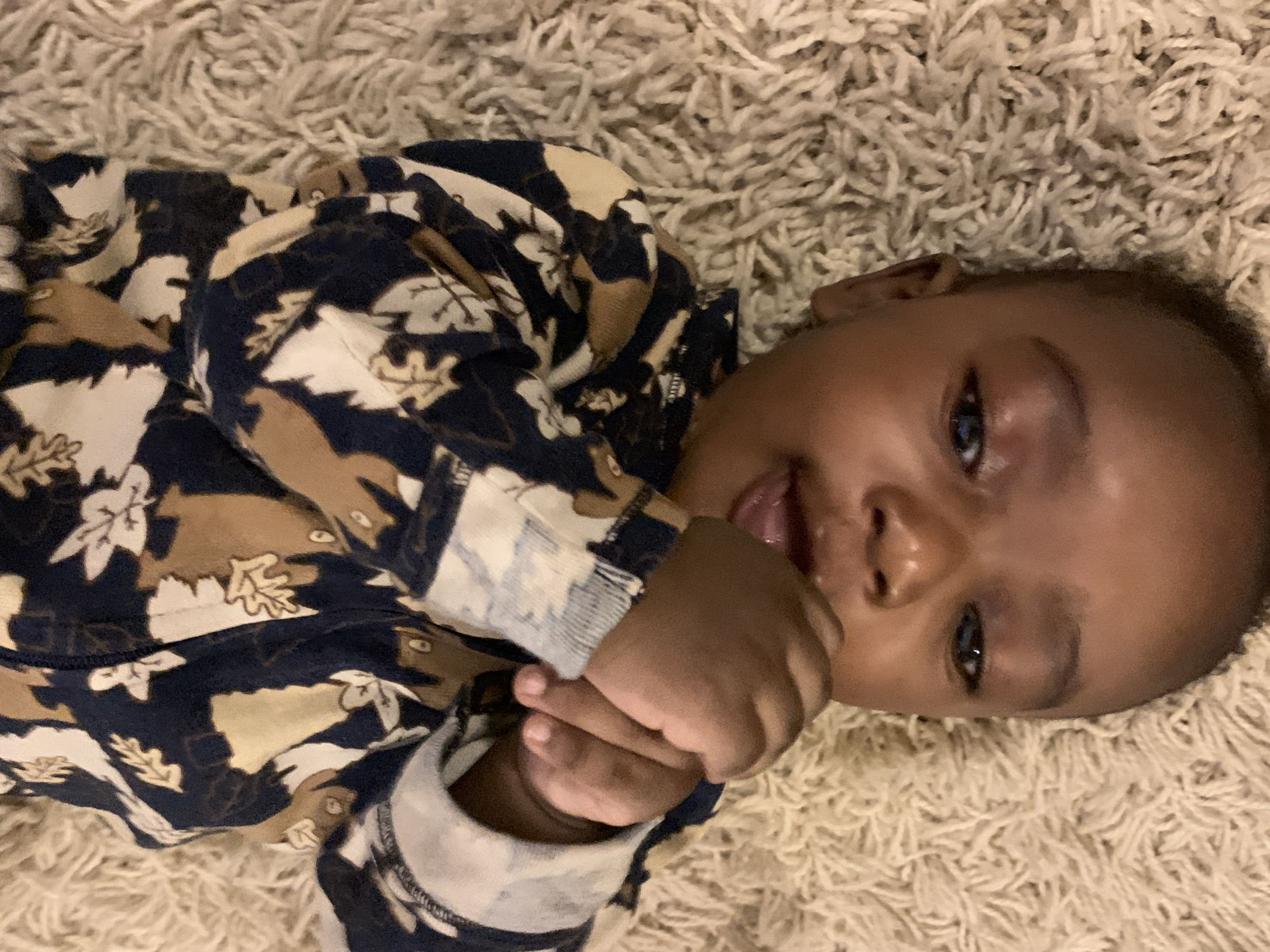 An infant, exhibiting dark skin pigmentation, is positioned supine on a light-colored, high-pile shaggy carpet