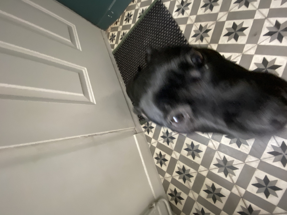 A close-up, low-angle photograph captures a black dog in the foreground, facing directly towards the camera. The dog displays short, glossy black fur, wide open eyes, and a slight head tilt. The background consists of a light-colored, paneled door with multiple recessed rectangular sections, positioned centrally. A dark, textured doormat lies on the patterned tiled floor directly in front of the door. The floor tiles feature a repeating geometric design of star-like shapes in shades of light gray, dark gray, and off-white. To the left of the door, a light-colored wall or door frame is visible. A fragment of a teal or dark green architectural element is discernible in the upper right corner, adjacent to the door. The perspective is from a low vantage point, suggesting the camera was positioned near ground level. The overall scene indicates an indoor setting, identified as a residential interior in Montreuil, France.