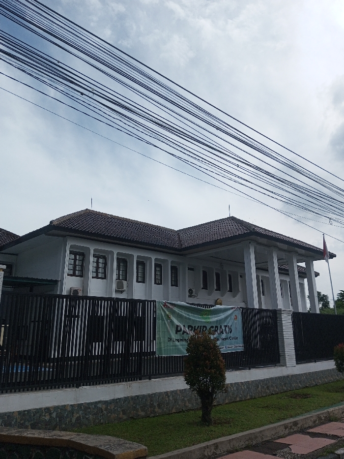 A two-story building with a brown tiled roof and white exterior is surrounded by a black metal fence. A green banner hangs on the fence reading "PARKIR GRATIS." Lush green grass and small bushes adorn the front yard. An Indonesian flag flies to the right of the building. Overhead, a dense network of black power lines stretches across a cloudy sky.