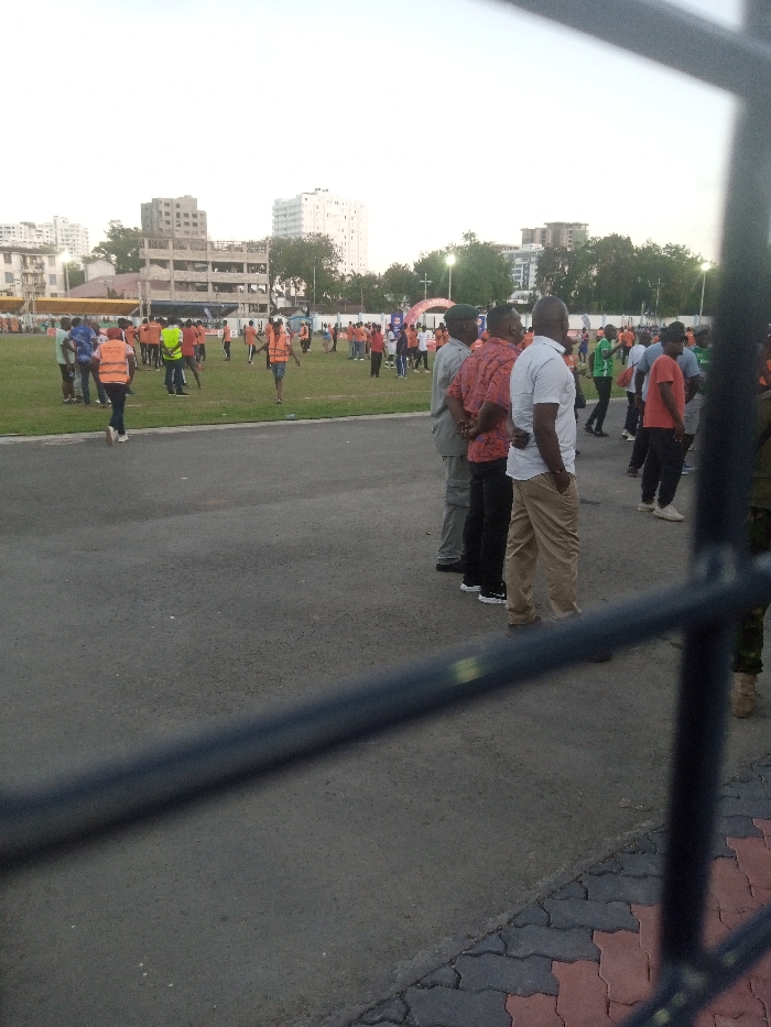 The image depicts an outdoor scene at a sports field or stadium, likely Mbaraki Sports Club in Mombasa, Ganjoni/Shimanzi ward, Kenya
