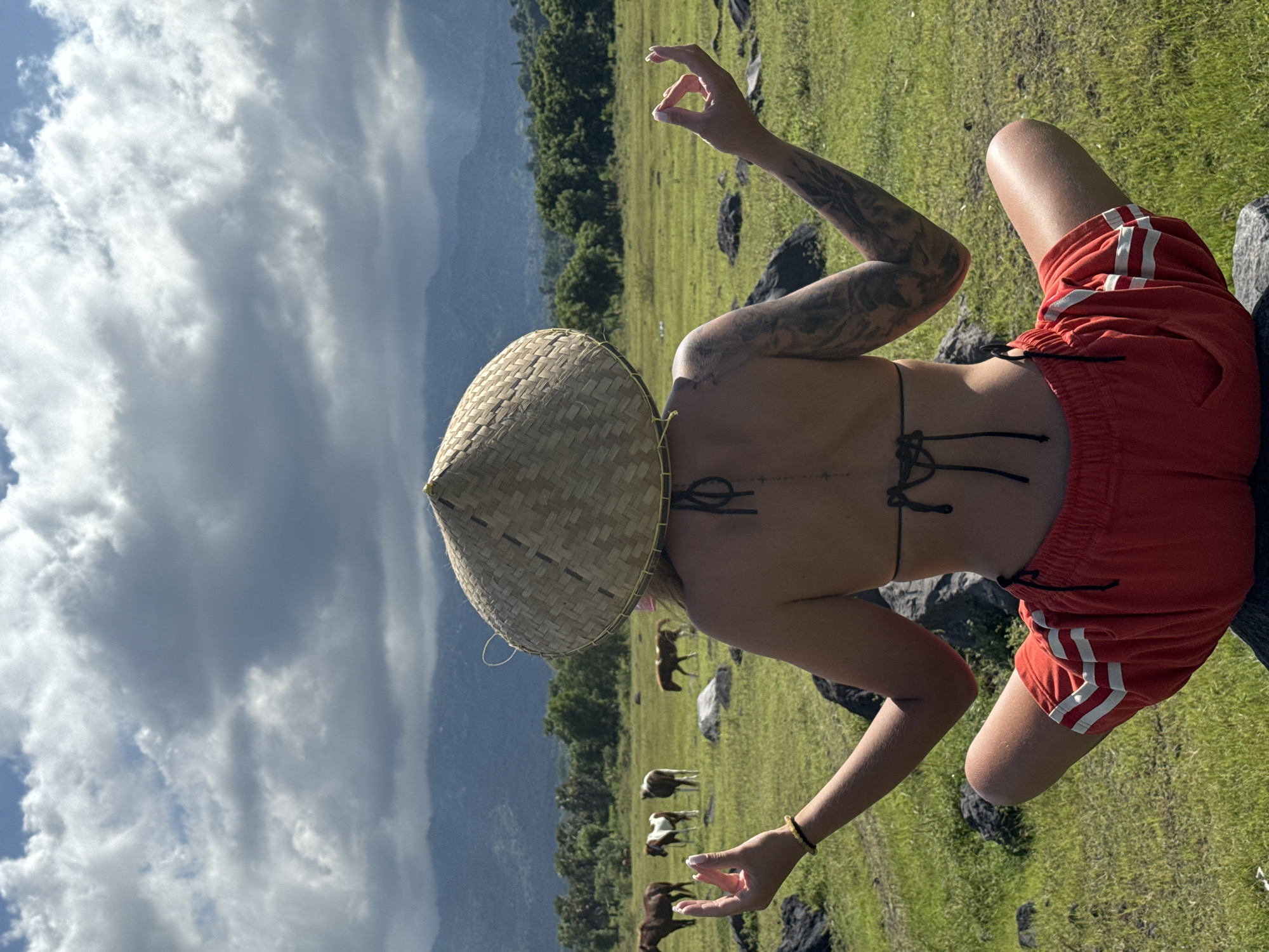 person with a straw conical hat, facing away from the camera, seated in a grassy field in Tianyar, Indonesia. The person has a dark bikini top and red shorts with white stripes on the sides. Tattoos are visible on their arms. The landscape includes green fields, dark rocks, and grazing horses in the background. Mountains and a cloudy sky are in the distance.