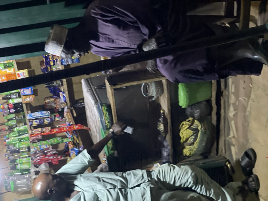 The image depicts an interior scene of a retail shop located in Chikaji, Nigeria, illuminated by artificial lighting