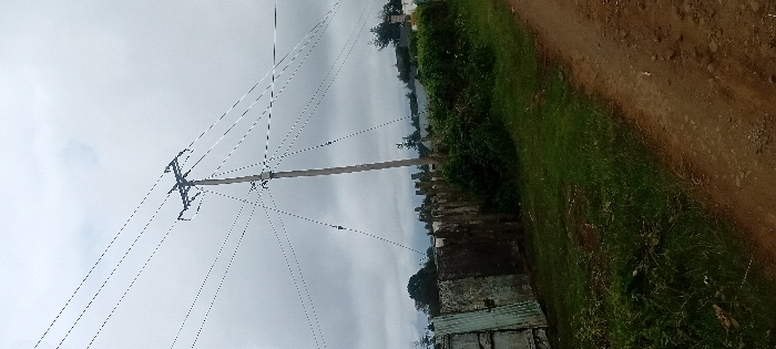 A utility pole stands with power lines stretching into the cloudy sky. Adjacent to the pole, a series of vertical posts are visible, along with a corrugated metal structure. A dirt path runs along the right edge of the frame, bordered by a patch of green grass. The scene has a somewhat overcast feel.