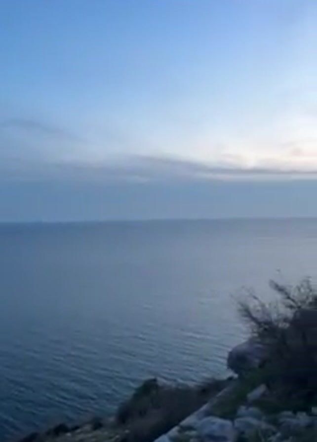 The video depicts a scenic view of the sea from a cliff during dusk or dawn
