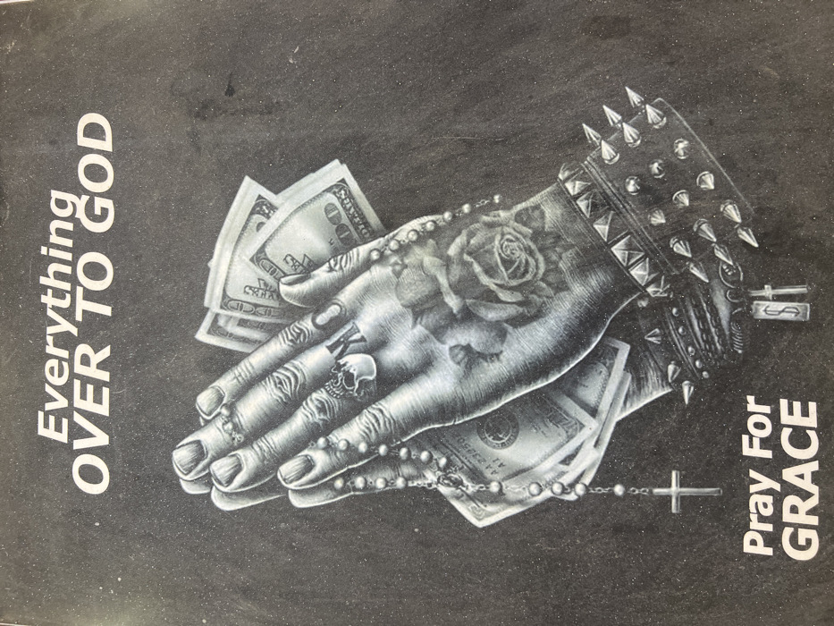 This is a grayscale graphic design, observed in the context of Naraguta Hausawa, Nigeria. The central subject is a pair of hands clasped in prayer. The hands are depicted with multiple details, including a rose tattoo on the back of the right hand and other patterned tattoos on the fingers. Several rings adorn the fingers, notably one with a skull design and another forming the letter 'M' on the right hand. A rosary with a crucifix drapes over the left hand. Tucked between the praying hands are several US hundred-dollar bills. The right wrist is adorned with a dark, studded leather bracelet. Below the hands, two small charms, one shaped as a cross and the other as a dollar sign, hang from an unseen chain. White, sans-serif text is present at the top, reading "Everything OVER TO GOD", and at the bottom, reading "Pray For GRACE". The background is uniformly dark gray with a visible speckled texture.