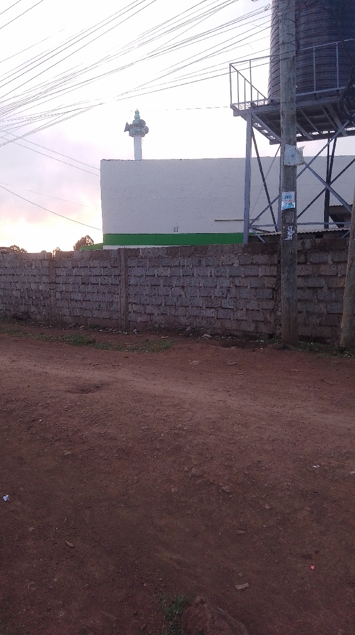 This image depicts an unpaved, reddish-brown dirt road in the foreground, located in Nkaimurunya ward, Kenya. Sparse green vegetation and small pieces of litter are visible on the ground. Extending across the midground is a grey concrete block boundary wall with vertical concrete pillars. Behind this wall, a white building with a horizontal green stripe near its base is visible. A light green minaret, equipped with multiple loudspeakers, rises from the roof of this building, indicating a mosque. To the right, a large, dark-colored water tank is elevated on a metallic scaffolding structure, featuring support beams, a ladder, and railings. A wooden utility pole, partially covered with posters, stands near the water tank and supports multiple overhead utility wires that crisscross the sky. The sky is pale, with faint pinkish-orange hues visible on the left horizon. No individuals are present in the scene.