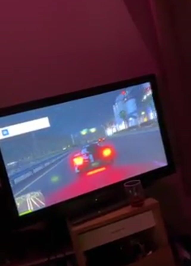 person playing Grand Theft Auto on a TV in a dimly lit room with pink lighting