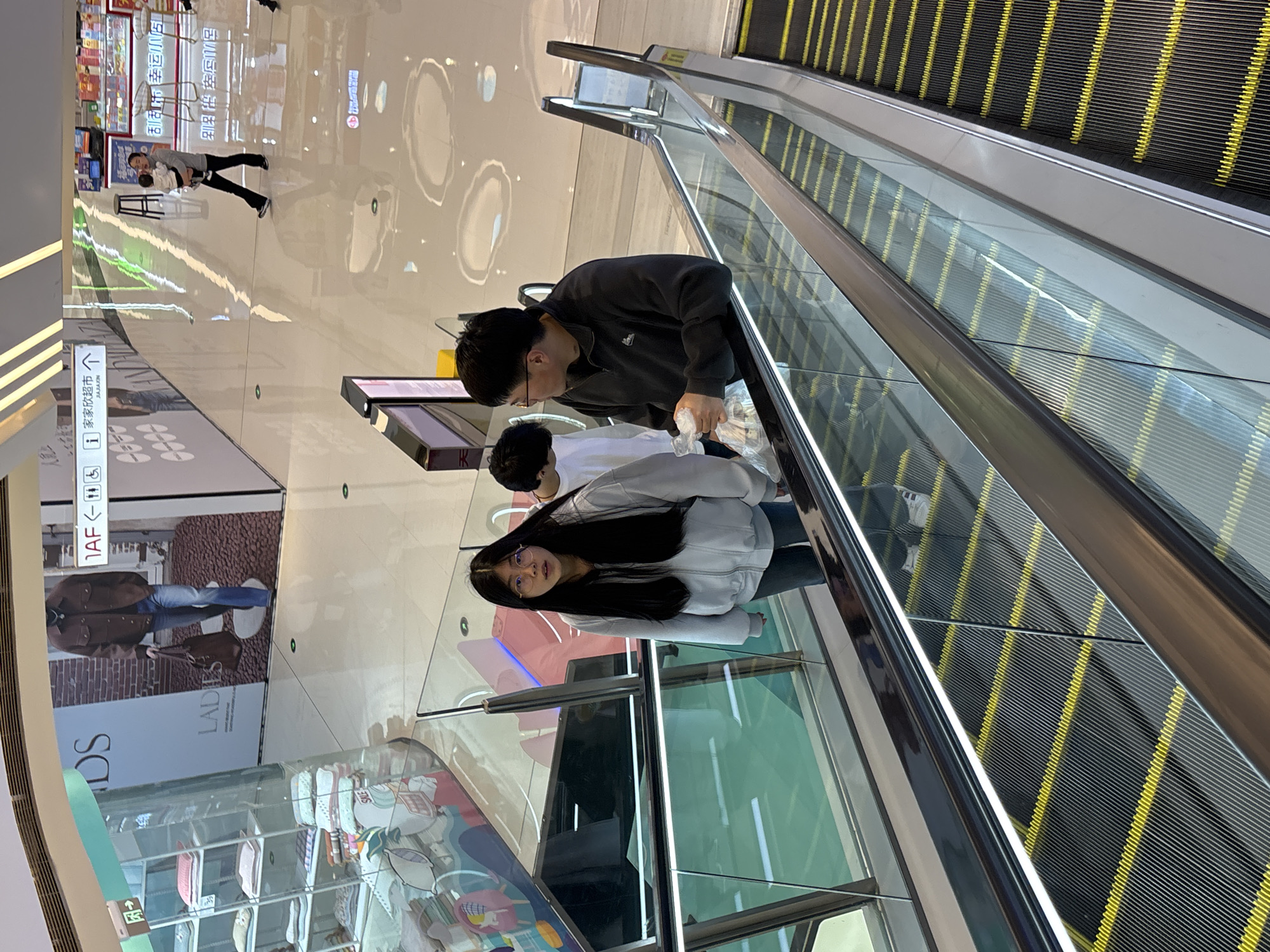 The image depicts an indoor scene within a shopping mall located in Jiangjin, China, identified by the "JJXJIN" marker and "家家欣超市" (Jia Jia Xin Supermarket) on a directional sign. In the foreground, an escalator is ascending to an upper level. Three individuals are on this escalator. On the left, a young female with long, dark hair and round glasses wears a light grey full-zip hoodie and dark pants, looking directly towards the viewer. To her right, a male with short dark hair and glasses, wearing a dark grey quarter-zip fleece jacket, holds a clear plastic bag with white contents in his left hand and gazes towards his right. Partially visible behind him is a third individual in a white long-sleeved shirt. The escalator itself has black steps with yellow safety lines, transparent glass balustrades, dark brown handrails, and illuminated side panels. The upper level of the mall features a glossy, reflective tiled floor with bright oval light reflections. To the left, a glass display unit contains folded textile products, some marked with "SALE" signs. A large wall advertisement behind this unit displays a man in a brown jacket and blue jeans, with text partially visible as "LADS" and "LADIES". Further in the background, a woman in dark pants and a light top walks leftward while carrying an infant on her left hip. Additional directional signs include "1AF" with arrows and accessibility symbols. In the far background, other retail displays and kiosks with merchandise and stools are visible. The overall environment is brightly lit.