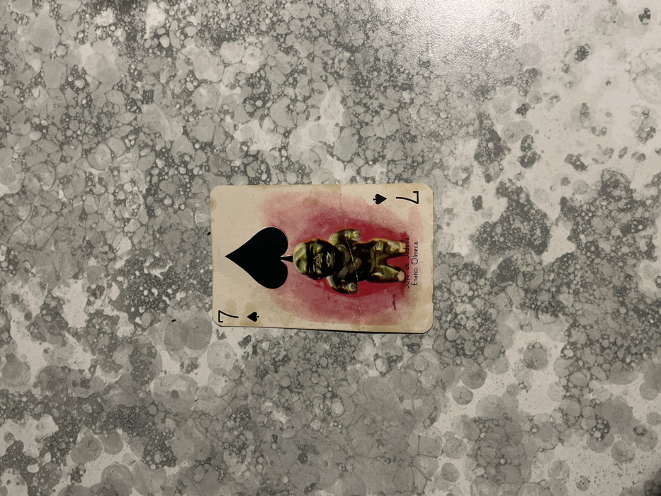 A playing card, the seven of spades, lies on a speckled gray and white surface. The card features a large black spade in the center, with a smaller spade and the number "7" in the upper right and lower left corners. An image of a small, bronze-colored figure, possibly a statue or figurine, is superimposed over a red wash, partially obscuring the spade. Text near the figure reads "Enano Olmeca." The card appears worn and aged.