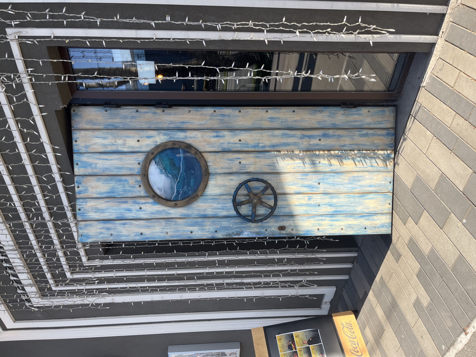 The image displays the entrance of a building in Plovdiv, Bulgaria. A single, vertically paneled wooden door, painted with a distressed blue and cream finish, is visible in the center, partially ajar to the right. The door is fitted with a circular, bronze-toned porthole containing an image of a breaking ocean wave, and below it, a dark-colored, circular handle resembling a ship's wheel with six spokes. To the immediate right of the wooden door is a dark-framed glass door or window, reflecting an outdoor scene and an interior light source. The building's facade surrounding the entrance is dark gray, framed by white, rectangular trim that creates a recessed effect. Numerous strands of small, white string lights hang vertically from the upper white trim, cascading down both sides of the entrance. The ground in front of the entrance is paved with rectangular interlocking blocks in alternating shades of light and dark gray. To the left of the door, a brown, wooden A-frame display stand, branded with "Coca-Cola" in yellow lettering, is positioned on the pavement. Direct sunlight illuminates the scene, casting distinct shadows from the door and facade elements onto the pavement and the door itself. No individuals or dynamic actions are depicted.