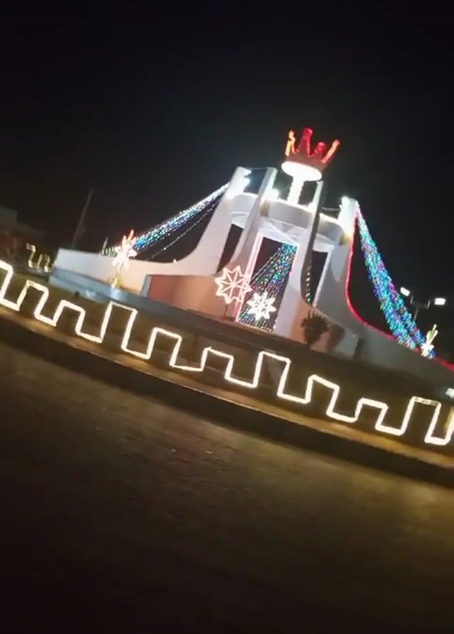 The video captures a roundabout at night, adorned with festive lights