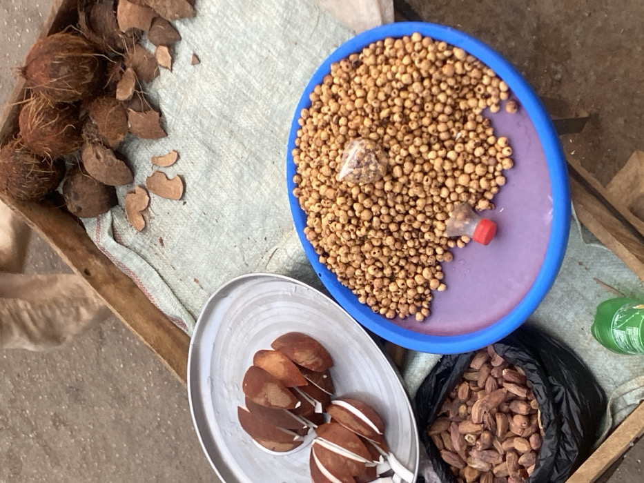 A variety of foods are displayed in containers. Coconuts and their husks sit to the left. A blue plastic tray holds a large quantity of round, tan seeds, along with a small plastic bag of similar seeds and a bottle. An oval metal plate contains halved brown nuts with white interiors. A black plastic bag is filled with dried dates. All items are presented in a wooden crate, on top of a grey patterned cloth.