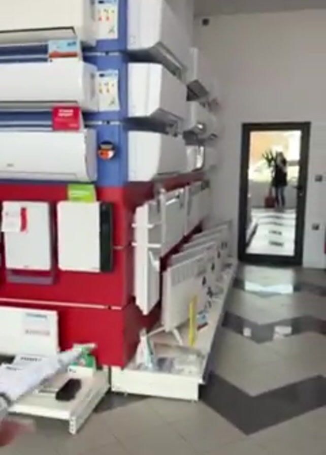 The video begins with a close-up of a hand holding a white paper airplane with black numbers printed on it. The background is an indoor space, a store showcasing air conditioners and electric radiators. The camera then pulls back, revealing rows of white air conditioning units mounted on a wall with red and blue panels. Beneath them are rows of electric radiators on shelves. A black and white tiled floor stretches toward a glass door where a person is standing, visible through the door. The camera focuses on the interior of the store, highlighting the displays and layout. The general impression is of a retail environment specializing in climate control appliances.