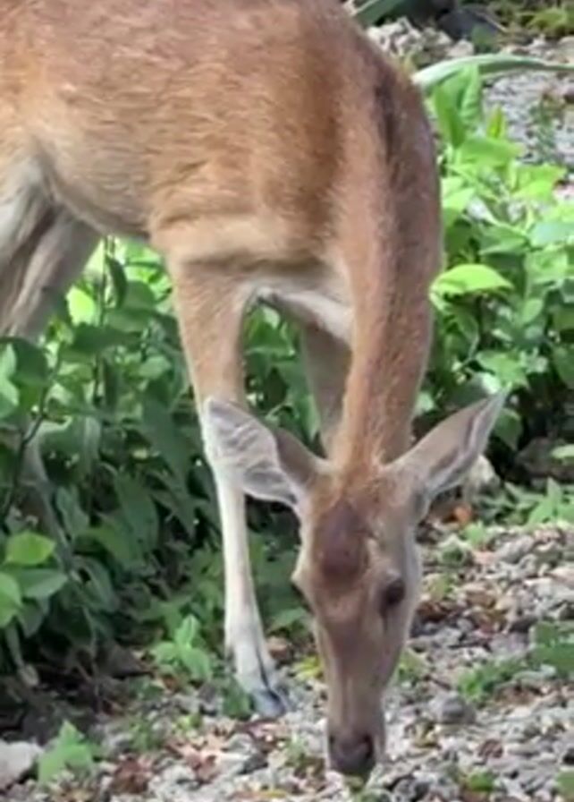 Here's a detailed description of the video: The video shows a deer grazing in a natural environment