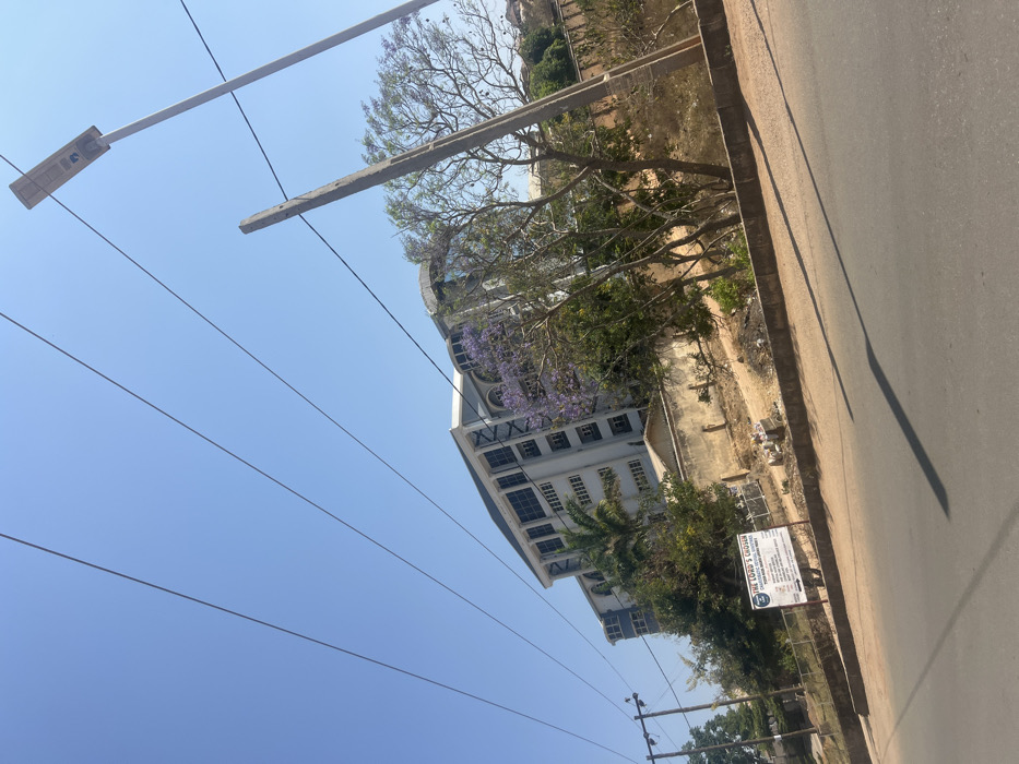 The image captures an outdoor, daytime scene in Jos, Plateau State, Nigeria, specifically opposite the New Government House, as identified by a prominent roadside sign for "THE LORD'S CHOSEN CHARISMATIC REVIVAL MOVEMENT." A large, multi-story building (at least five floors visible) with a light-colored facade, numerous rectangular windows, and a modern architectural design featuring curved and angular sections with blue-tinted reflective glass, dominates the midground. In front of and to the right of this structure, several trees are visible, including one with distinctive purple blossoms. The foreground consists of a paved asphalt road, displaying elongated shadows from unseen objects to the left, indicating an angled sun. Beyond the road, an unpaved, uneven dirt area with sparse vegetation and some debris is present, bordered by a low, light-colored concrete wall. Overhead utility wires diagonally traverse the clear blue sky. On the far right, a tall streetlight pole equipped with a solar panel and a light fixture stands beside a shorter, broken concrete utility pole. On the far left, a wooden utility pole with multiple crossarms and associated wiring is visible. No individuals or specific actions are depicted in the scene.