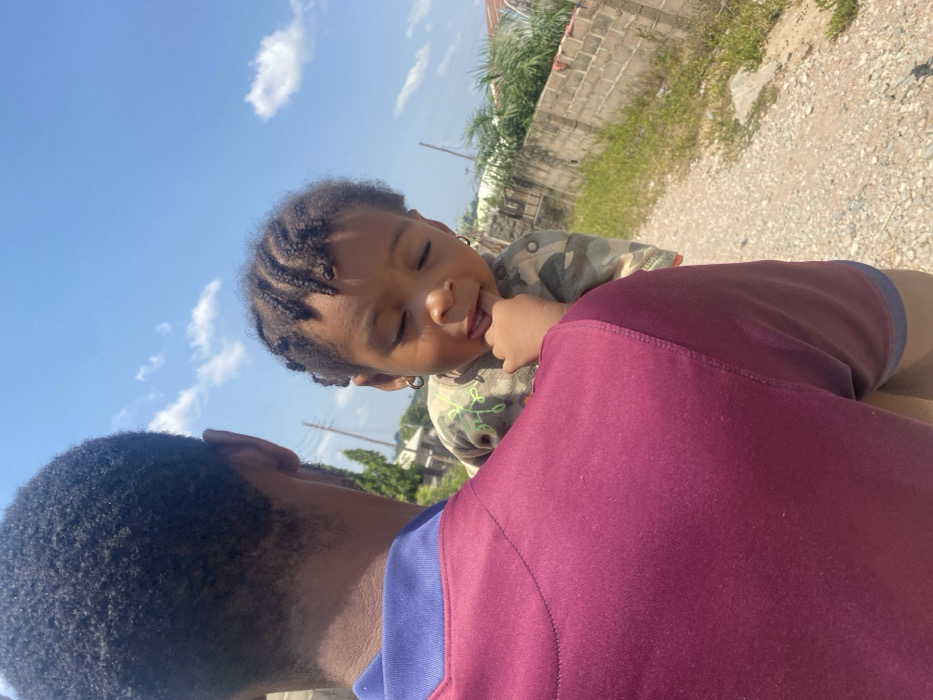 The image presents an outdoor scene in Zango-ndaji, Nigeria, under a clear blue sky with scattered white clouds. An adult, viewed from behind and primarily showing the upper back, wears a maroon short-sleeved polo shirt with a navy blue collar. This individual carries a young child, positioned over their shoulder, who is facing forward and slightly to the right. The child has dark skin, hair styled in cornrows, and wears a camouflage-patterned long-sleeved top with green leaf motifs. Small hoop earrings are visible in both of the child's ears. The child's eyes are closed, and their right hand, with fingers inserted, is at their mouth. The immediate ground consists of an unpaved dirt or gravel path. In the background, an unfinished concrete block wall topped with a security barrier runs along the right side, bordered by sparse green vegetation. Distant structures and utility poles are visible on the left horizon.