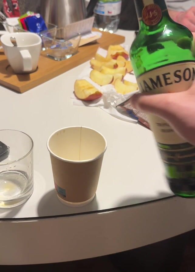 person pouring Jameson whiskey into a glass on a white table. There is a brown paper cup beside the glass. In the background, there is a silver kettle, a bottle of water, a wooden cutting board with sliced apples, and other objects, including white mugs. A phone is placed near the glass on the table. The person pouring the whiskey is wearing a white shirt and has a red bracelet on their wrist. The scene appears to be indoors.
