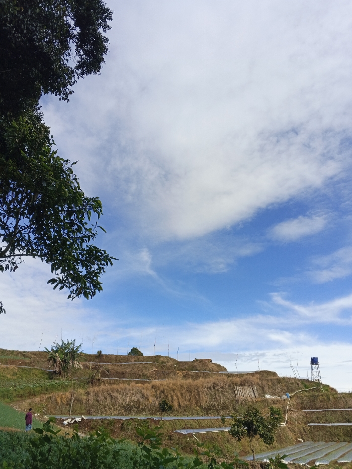 Terraced hills under a blue sky streaked with white clouds form an agricultural landscape